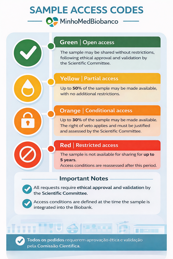 - All access requests are subject to ethical approval and validation by the MinhoMedBiobanco Scientific Committee.