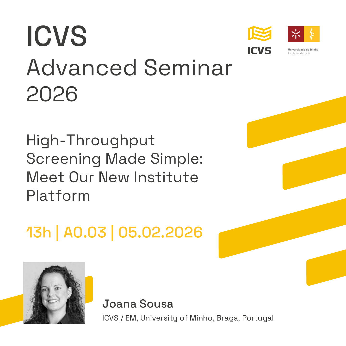 February 5th at 1 pm, don’t miss Joana Sousa‘s “High-Throughput Screening Made Simple: Meet Our New Institute Platform" at the A0.03 auditorium in UMinho’s School of Medicine.