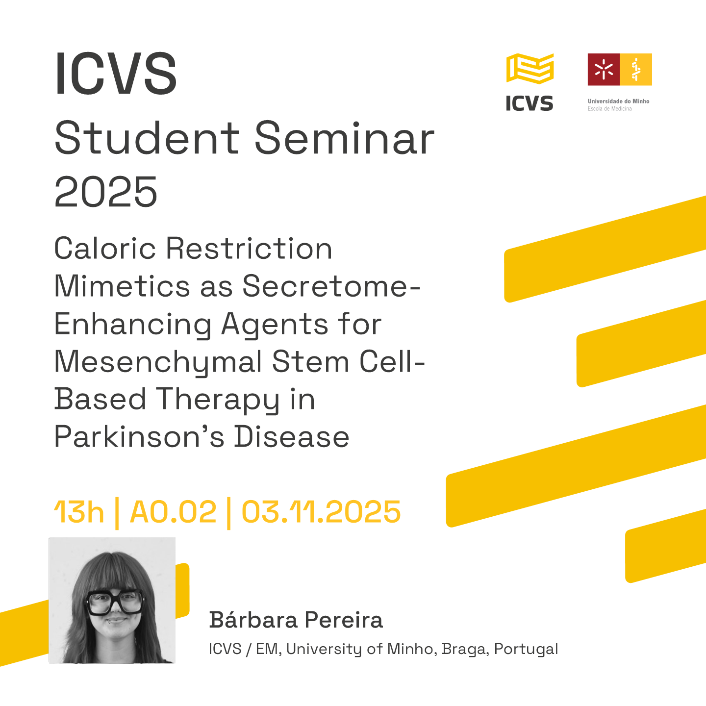 November 3rd at 1 pm, don’t miss Bárbara Pereira‘s “Caloric Restriction Mimetics as Secretome-Enhancing Agents for Mesenchymal Stem Cell-Based Therapy in Parkinson's Disease” at the A0.02 auditorium in UMinho’s School of Medicine.